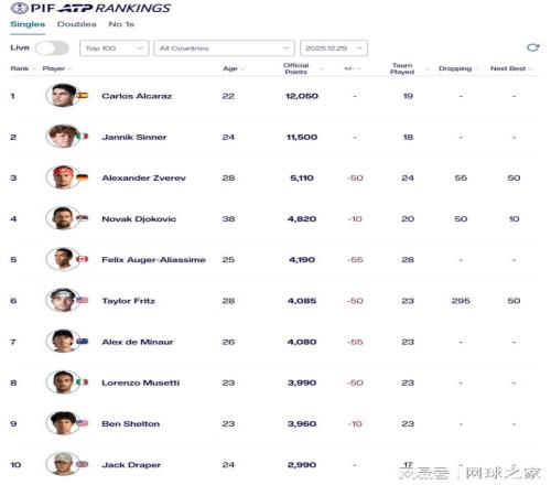 从当前的顶尖球员被扣分情况来看,除了阿尔卡拉斯、辛纳和德雷珀未被扣分之外,前十球员中的七人均因新规受到了不同程度的影响。让人欣慰的是,扣分并未引发前十排名地震,所有前十球员的位次并未因此发生改变。