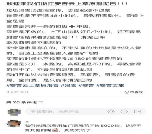前不久,去浙江安吉“云上草原”滑雪的游客纷纷表示“被坑惨了”。因为气温过高、客流量大等原因,融化的雪道让游客们的体验大打折扣。云上草原景区不得不发出道歉公告,并承诺补送给游客们一张两日滑雪票。