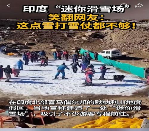 在一众“避雷”帖里,有人幽默地翻出近期登上热搜的印度滑雪场。在印度北部默纳利,有商家打造了一个迷你滑雪场,实际体验和宣传相去甚远。所谓滑雪场面积不足200平米,四周是光秃秃的土坡,雪层薄到露出了黄土。而门票价格也不低,需要500卢比。